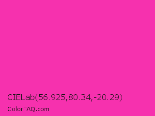 CIELab 56.925,80.34,-20.29 Color is a normal magenta color and the nearest color is Frostbite #e936a7. Hex code #f631ae and RGB value is rgb(246,49,174). In RGB color space, this color is composed of 96% red, 19% green, 68% blue, In CMYK color space, this color is composed of 0% cyan, 80% magenta, 29% yellow , 4% black , In HSL color space, this color has a hue angle of 322° , 92% saturation and 58% lightness.