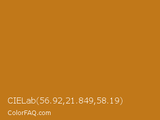 CIELab 56.92,21.849,58.19 Color is a normal orange color and the nearest color is Bourbon #ba6f1e. Hex code #c17819 and RGB value is rgb(193,120,25). In RGB color space, this color is composed of 76% red, 47% green, 10% blue, In CMYK color space, this color is composed of 0% cyan, 38% magenta, 87% yellow , 24% black , In HSL color space, this color has a hue angle of 34° , 77% saturation and 43% lightness.