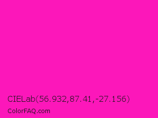 CIELab 56.932,87.41,-27.156 Color is a normal magenta color and the nearest color is Shocking Pink #fc0fc0. Hex code #fc17ba and RGB value is rgb(252,23,186). In RGB color space, this color is composed of 99% red, 9% green, 73% blue, In CMYK color space, this color is composed of 0% cyan, 91% magenta, 26% yellow , 1% black , In HSL color space, this color has a hue angle of 317° , 97% saturation and 54% lightness.