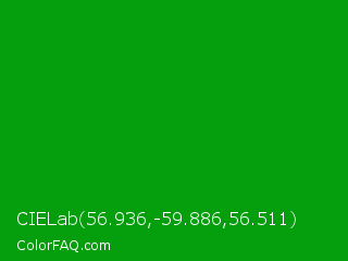 CIELab 56.936,-59.886,56.511 Color is a normal green color and the nearest color is Islamic Green #009000. Hex code #059f0d and RGB value is rgb(5,159,13). In RGB color space, this color is composed of 2% red, 62% green, 5% blue, In CMYK color space, this color is composed of 97% cyan, 0% magenta, 92% yellow , 38% black , In HSL color space, this color has a hue angle of 123° , 94% saturation and 32% lightness.