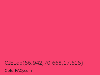 CIELab 56.942,70.668,17.515 Color is a light red color and the nearest color is Infra Red #ff496c. Hex code #f8416e and RGB value is rgb(248,65,110). In RGB color space, this color is composed of 97% red, 25% green, 43% blue, In CMYK color space, this color is composed of 0% cyan, 74% magenta, 56% yellow , 3% black , In HSL color space, this color has a hue angle of 345° , 93% saturation and 61% lightness.