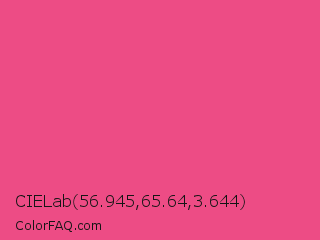 CIELab 56.945,65.64,3.644 Color is a light rose color and the nearest color is French Rose #f64a8a. Hex code #ed4c85 and RGB value is rgb(237,76,133). In RGB color space, this color is composed of 93% red, 30% green, 52% blue, In CMYK color space, this color is composed of 0% cyan, 68% magenta, 44% yellow , 7% black , In HSL color space, this color has a hue angle of 339° , 82% saturation and 61% lightness.