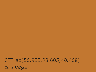 CIELab 56.955,23.605,49.468 Color is a normal orange color and the nearest color is Copper #b87333. Hex code #c27730 and RGB value is rgb(194,119,48). In RGB color space, this color is composed of 76% red, 47% green, 19% blue, In CMYK color space, this color is composed of 0% cyan, 39% magenta, 75% yellow , 24% black , In HSL color space, this color has a hue angle of 29° , 60% saturation and 47% lightness.