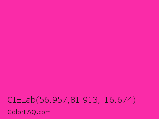 CIELab 56.957,81.913,-16.674 Color is a normal magenta color and the nearest color is Persian Rose #fe28a2. Hex code #fa2ba8 and RGB value is rgb(250,43,168). In RGB color space, this color is composed of 98% red, 17% green, 66% blue, In CMYK color space, this color is composed of 0% cyan, 83% magenta, 33% yellow , 2% black , In HSL color space, this color has a hue angle of 324° , 95% saturation and 57% lightness.