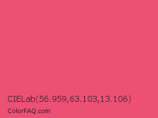CIELab 56.959,63.103,13.106 Color is a light red color and the nearest color is Dark Pink #e75480. Hex code #ed4f75 and RGB value is rgb(237,79,117). In RGB color space, this color is composed of 93% red, 31% green, 46% blue, In CMYK color space, this color is composed of 0% cyan, 67% magenta, 51% yellow , 7% black , In HSL color space, this color has a hue angle of 346° , 81% saturation and 62% lightness.