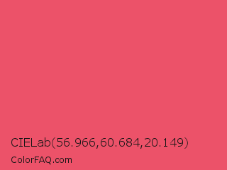 CIELab 56.966,60.684,20.149 Color is a light red color and the nearest color is Mandy #e25465. Hex code #ec5269 and RGB value is rgb(236,82,105). In RGB color space, this color is composed of 93% red, 32% green, 41% blue, In CMYK color space, this color is composed of 0% cyan, 65% magenta, 56% yellow , 7% black , In HSL color space, this color has a hue angle of 351° , 80% saturation and 62% lightness.