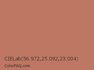 CIELab 56.972,25.092,23.004 Color is a normal red color and the nearest color is Contessa #c6726b. Hex code #bd7762 and RGB value is rgb(189,119,98). In RGB color space, this color is composed of 74% red, 47% green, 38% blue, In CMYK color space, this color is composed of 0% cyan, 37% magenta, 48% yellow , 26% black , In HSL color space, this color has a hue angle of 14° , 41% saturation and 56% lightness.