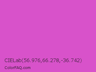 CIELab 56.976,66.278,-36.742 Color is a normal magenta color and the nearest color is Fuchsia Pink #c154c1. Hex code #d852ca and RGB value is rgb(216,82,202). In RGB color space, this color is composed of 85% red, 32% green, 79% blue, In CMYK color space, this color is composed of 0% cyan, 62% magenta, 6% yellow , 15% black , In HSL color space, this color has a hue angle of 306° , 63% saturation and 58% lightness.