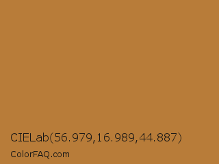 CIELab 56.979,16.989,44.887 Color is a normal orange color and the nearest color is Copper #b87333. Hex code #b87c39 and RGB value is rgb(184,124,57). In RGB color space, this color is composed of 72% red, 49% green, 22% blue, In CMYK color space, this color is composed of 0% cyan, 33% magenta, 69% yellow , 28% black , In HSL color space, this color has a hue angle of 32° , 53% saturation and 47% lightness.