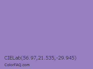 CIELab 56.97,21.535,-29.945 Color is a light violet color and the nearest color is Lavender Purple #967bb6. Hex code #947ebd and RGB value is rgb(148,126,189). In RGB color space, this color is composed of 58% red, 49% green, 74% blue, In CMYK color space, this color is composed of 22% cyan, 33% magenta, 0% yellow , 26% black , In HSL color space, this color has a hue angle of 261° , 32% saturation and 62% lightness.