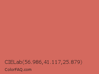 CIELab 56.986,41.117,25.879 Color is a normal red color and the nearest color is Fuzzy Wuzzy #cc6666. Hex code #d4695e and RGB value is rgb(212,105,94). In RGB color space, this color is composed of 83% red, 41% green, 37% blue, In CMYK color space, this color is composed of 0% cyan, 50% magenta, 56% yellow , 17% black , In HSL color space, this color has a hue angle of 6° , 58% saturation and 60% lightness.