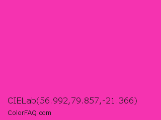 CIELab 56.992,79.857,-21.366 Color is a normal magenta color and the nearest color is Frostbite #e936a7. Hex code #f533b0 and RGB value is rgb(245,51,176). In RGB color space, this color is composed of 96% red, 20% green, 69% blue, In CMYK color space, this color is composed of 0% cyan, 79% magenta, 28% yellow , 4% black , In HSL color space, this color has a hue angle of 321° , 91% saturation and 58% lightness.