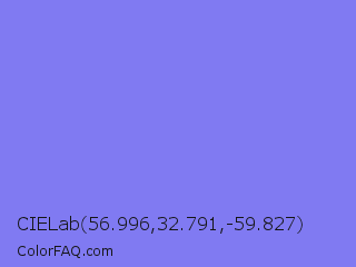 CIELab 56.996,32.791,-59.827 Color is a light indigo color and the nearest color is Medium Slate Blue #7b68ee. Hex code #807af2 and RGB value is rgb(128,122,242). In RGB color space, this color is composed of 50% red, 48% green, 95% blue, In CMYK color space, this color is composed of 47% cyan, 50% magenta, 0% yellow , 5% black , In HSL color space, this color has a hue angle of 243° , 82% saturation and 71% lightness.