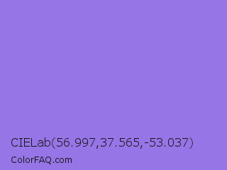CIELab 56.997,37.565,-53.037 Color is a light indigo color and the nearest color is Medium Purple #9370db. Hex code #9675e6 and RGB value is rgb(150,117,230). In RGB color space, this color is composed of 59% red, 46% green, 90% blue, In CMYK color space, this color is composed of 35% cyan, 49% magenta, 0% yellow , 10% black , In HSL color space, this color has a hue angle of 258° , 69% saturation and 68% lightness.