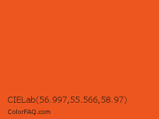 CIELab 56.997,55.566,58.97 Color is a normal orange color and the nearest color is Flame #e25822. Hex code #ed571f and RGB value is rgb(237,87,31). In RGB color space, this color is composed of 93% red, 34% green, 12% blue, In CMYK color space, this color is composed of 0% cyan, 63% magenta, 87% yellow , 7% black , In HSL color space, this color has a hue angle of 16° , 85% saturation and 53% lightness.