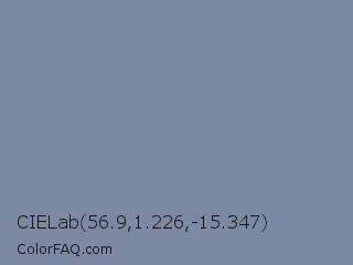 CIELab 56.9,1.226,-15.347 Color is a normal blue color and the nearest color is Shadow Blue #778ba5. Hex code #7c89a3 and RGB value is rgb(124,137,163). In RGB color space, this color is composed of 49% red, 54% green, 64% blue, In CMYK color space, this color is composed of 24% cyan, 16% magenta, 0% yellow , 36% black , In HSL color space, this color has a hue angle of 220° , 17% saturation and 56% lightness.