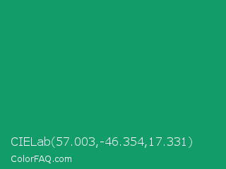 CIELab 57.003,-46.354,17.331 Color is a normal green color and the nearest color is Green NCS #009f6b. Hex code #129c69 and RGB value is rgb(18,156,105). In RGB color space, this color is composed of 7% red, 61% green, 41% blue, In CMYK color space, this color is composed of 88% cyan, 0% magenta, 33% yellow , 39% black , In HSL color space, this color has a hue angle of 158° , 79% saturation and 34% lightness.