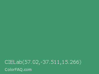 CIELab 57.02,-37.511,15.266 Color is a normal green color and the nearest color is Illuminating Emerald #319177. Hex code #3f996d and RGB value is rgb(63,153,109). In RGB color space, this color is composed of 25% red, 60% green, 43% blue, In CMYK color space, this color is composed of 59% cyan, 0% magenta, 29% yellow , 40% black , In HSL color space, this color has a hue angle of 151° , 42% saturation and 42% lightness.