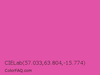 CIELab 57.033,63.804,-15.774 Color is a normal magenta color and the nearest color is Raspberry Pink #e25098. Hex code #e252a6 and RGB value is rgb(226,82,166). In RGB color space, this color is composed of 89% red, 32% green, 65% blue, In CMYK color space, this color is composed of 0% cyan, 64% magenta, 27% yellow , 11% black , In HSL color space, this color has a hue angle of 325° , 71% saturation and 60% lightness.