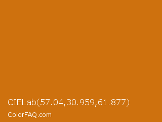 CIELab 57.04,30.959,61.877 Color is a normal orange color and the nearest color is Meteor #d07d12. Hex code #ce710e and RGB value is rgb(206,113,14). In RGB color space, this color is composed of 81% red, 44% green, 5% blue, In CMYK color space, this color is composed of 0% cyan, 45% magenta, 93% yellow , 19% black , In HSL color space, this color has a hue angle of 31° , 87% saturation and 43% lightness.