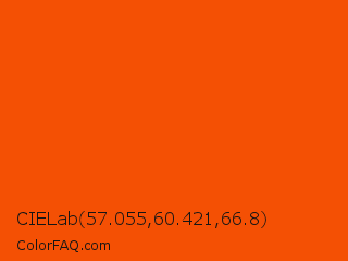 CIELab 57.055,60.421,66.8 Color is a normal orange color and the nearest color is Tangelo #f94d00. Hex code #f45004 and RGB value is rgb(244,80,4). In RGB color space, this color is composed of 96% red, 31% green, 2% blue, In CMYK color space, this color is composed of 0% cyan, 67% magenta, 98% yellow , 4% black , In HSL color space, this color has a hue angle of 19° , 97% saturation and 49% lightness.