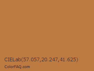 CIELab 57.057,20.247,41.625 Color is a normal orange color and the nearest color is Copper #b87333. Hex code #bc7a40 and RGB value is rgb(188,122,64). In RGB color space, this color is composed of 74% red, 48% green, 25% blue, In CMYK color space, this color is composed of 0% cyan, 35% magenta, 66% yellow , 26% black , In HSL color space, this color has a hue angle of 28° , 49% saturation and 49% lightness.