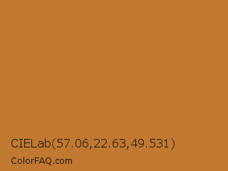 CIELab 57.06,22.63,49.531 Color is a normal orange color and the nearest color is Copper #b87333. Hex code #c17830 and RGB value is rgb(193,120,48). In RGB color space, this color is composed of 76% red, 47% green, 19% blue, In CMYK color space, this color is composed of 0% cyan, 38% magenta, 75% yellow , 24% black , In HSL color space, this color has a hue angle of 30° , 60% saturation and 47% lightness.