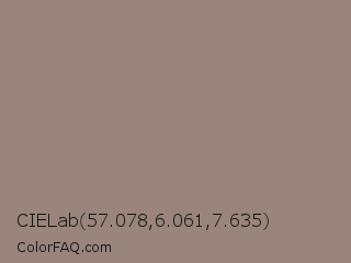 CIELab 57.078,6.061,7.635 Color is a normal orange color and the nearest color is Cinereous #98817b. Hex code #99857c and RGB value is rgb(153,133,124). In RGB color space, this color is composed of 60% red, 52% green, 49% blue, In CMYK color space, this color is composed of 0% cyan, 13% magenta, 19% yellow , 40% black , In HSL color space, this color has a hue angle of 19° , 12% saturation and 54% lightness.