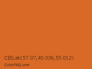 CIELab 57.07,40.036,55.012 Color is a normal orange color and the nearest color is Vivid Red Tangelo #df6124. Hex code #d96926 and RGB value is rgb(217,105,38). In RGB color space, this color is composed of 85% red, 41% green, 15% blue, In CMYK color space, this color is composed of 0% cyan, 52% magenta, 82% yellow , 15% black , In HSL color space, this color has a hue angle of 22° , 70% saturation and 50% lightness.