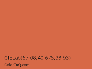 CIELab 57.08,40.675,38.93 Color is a normal red color and the nearest color is Red Damask #da6a41. Hex code #d76947 and RGB value is rgb(215,105,71). In RGB color space, this color is composed of 84% red, 41% green, 28% blue, In CMYK color space, this color is composed of 0% cyan, 51% magenta, 67% yellow , 16% black , In HSL color space, this color has a hue angle of 14° , 64% saturation and 56% lightness.