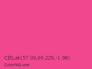 CIELab 57.09,69.229,-1.98 Color is a light rose color and the nearest color is French Rose #f64a8a. Hex code #f0478f and RGB value is rgb(240,71,143). In RGB color space, this color is composed of 94% red, 28% green, 56% blue, In CMYK color space, this color is composed of 0% cyan, 70% magenta, 40% yellow , 6% black , In HSL color space, this color has a hue angle of 334° , 85% saturation and 61% lightness.