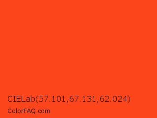CIELab 57.101,67.131,62.024 Color is a normal red color and the nearest color is Orioles Orange #fb4f14. Hex code #fc451a and RGB value is rgb(252,69,26). In RGB color space, this color is composed of 99% red, 27% green, 10% blue, In CMYK color space, this color is composed of 0% cyan, 73% magenta, 90% yellow , 1% black , In HSL color space, this color has a hue angle of 11° , 97% saturation and 55% lightness.