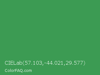 CIELab 57.103,-44.021,29.577 Color is a normal green color and the nearest color is Chateau Green #40a860. Hex code #3c9b53 and RGB value is rgb(60,155,83). In RGB color space, this color is composed of 24% red, 61% green, 33% blue, In CMYK color space, this color is composed of 61% cyan, 0% magenta, 46% yellow , 39% black , In HSL color space, this color has a hue angle of 135° , 44% saturation and 42% lightness.