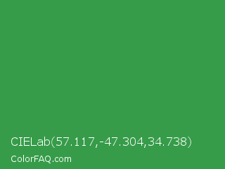 CIELab 57.117,-47.304,34.738 Color is a normal green color and the nearest color is Sea Green #2e8b57. Hex code #369c49 and RGB value is rgb(54,156,73). In RGB color space, this color is composed of 21% red, 61% green, 29% blue, In CMYK color space, this color is composed of 65% cyan, 0% magenta, 53% yellow , 39% black , In HSL color space, this color has a hue angle of 131° , 49% saturation and 41% lightness.