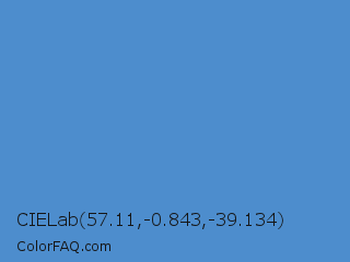 CIELab 57.11,-0.843,-39.134 Color is a normal blue color and the nearest color is Celestial Blue #4997d0. Hex code #4d8dcd and RGB value is rgb(77,141,205). In RGB color space, this color is composed of 30% red, 55% green, 80% blue, In CMYK color space, this color is composed of 62% cyan, 31% magenta, 0% yellow , 20% black , In HSL color space, this color has a hue angle of 210° , 56% saturation and 55% lightness.
