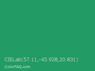 CIELab 57.11,-45.928,20.831 Color is a normal green color and the nearest color is Eucalyptus #278a5b. Hex code #239c63 and RGB value is rgb(35,156,99). In RGB color space, this color is composed of 14% red, 61% green, 39% blue, In CMYK color space, this color is composed of 78% cyan, 0% magenta, 37% yellow , 39% black , In HSL color space, this color has a hue angle of 152° , 63% saturation and 37% lightness.