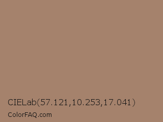 CIELab 57.121,10.253,17.041 Color is a normal orange color and the nearest color is Beaver #9f8170. Hex code #a5826c and RGB value is rgb(165,130,108). In RGB color space, this color is composed of 65% red, 51% green, 42% blue, In CMYK color space, this color is composed of 0% cyan, 21% magenta, 35% yellow , 35% black , In HSL color space, this color has a hue angle of 23° , 24% saturation and 54% lightness.