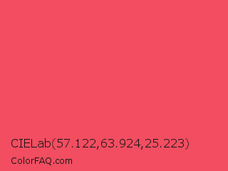 CIELab 57.122,63.924,25.223 Color is a light red color and the nearest color is Carnation #f95a61. Hex code #f24d61 and RGB value is rgb(242,77,97). In RGB color space, this color is composed of 95% red, 30% green, 38% blue, In CMYK color space, this color is composed of 0% cyan, 68% magenta, 60% yellow , 5% black , In HSL color space, this color has a hue angle of 353° , 86% saturation and 63% lightness.
