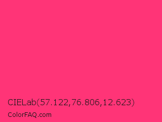 CIELab 57.122,76.806,12.623 Color is a normal rose color and the nearest color is Sasquatch Socks #ff4681. Hex code #ff3477 and RGB value is rgb(255,52,119). In RGB color space, this color is composed of 100% red, 20% green, 47% blue, In CMYK color space, this color is composed of 0% cyan, 80% magenta, 53% yellow , 0% black , In HSL color space, this color has a hue angle of 340° , 100% saturation and 60% lightness.