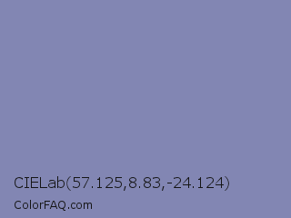 CIELab 57.125,8.83,-24.124 Color is a light blue color and the nearest color is Wild Blue Yonder #7a89b8. Hex code #8286b3 and RGB value is rgb(130,134,179). In RGB color space, this color is composed of 51% red, 53% green, 70% blue, In CMYK color space, this color is composed of 27% cyan, 25% magenta, 0% yellow , 30% black , In HSL color space, this color has a hue angle of 235° , 24% saturation and 61% lightness.