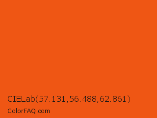 CIELab 57.131,56.488,62.861 Color is a normal orange color and the nearest color is Orioles Orange #fb4f14. Hex code #ef5614 and RGB value is rgb(239,86,20). In RGB color space, this color is composed of 94% red, 34% green, 8% blue, In CMYK color space, this color is composed of 0% cyan, 64% magenta, 92% yellow , 6% black , In HSL color space, this color has a hue angle of 18° , 87% saturation and 51% lightness.