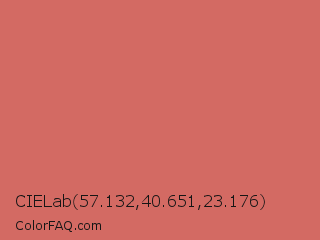 CIELab 57.132,40.651,23.176 Color is a light red color and the nearest color is Fuzzy Wuzzy #cc6666. Hex code #d36a63 and RGB value is rgb(211,106,99). In RGB color space, this color is composed of 83% red, 42% green, 39% blue, In CMYK color space, this color is composed of 0% cyan, 50% magenta, 53% yellow , 17% black , In HSL color space, this color has a hue angle of 4° , 56% saturation and 61% lightness.