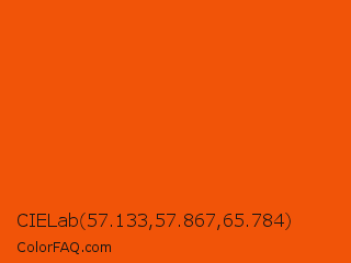 CIELab 57.133,57.867,65.784 Color is a normal orange color and the nearest color is Persimmon #ec5800. Hex code #f15408 and RGB value is rgb(241,84,8). In RGB color space, this color is composed of 95% red, 33% green, 3% blue, In CMYK color space, this color is composed of 0% cyan, 65% magenta, 97% yellow , 5% black , In HSL color space, this color has a hue angle of 20° , 94% saturation and 49% lightness.