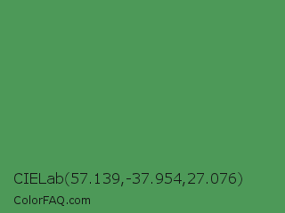 CIELab 57.139,-37.954,27.076 Color is a normal green color and the nearest color is Fruit Salad #4f9d5d. Hex code #4d9958 and RGB value is rgb(77,153,88). In RGB color space, this color is composed of 30% red, 60% green, 35% blue, In CMYK color space, this color is composed of 50% cyan, 0% magenta, 42% yellow , 40% black , In HSL color space, this color has a hue angle of 129° , 33% saturation and 45% lightness.