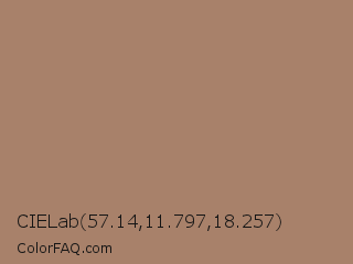 CIELab 57.14,11.797,18.257 Color is a normal orange color and the nearest color is Beaver #9f8170. Hex code #a8816a and RGB value is rgb(168,129,106). In RGB color space, this color is composed of 66% red, 51% green, 42% blue, In CMYK color space, this color is composed of 0% cyan, 23% magenta, 37% yellow , 34% black , In HSL color space, this color has a hue angle of 22° , 26% saturation and 54% lightness.