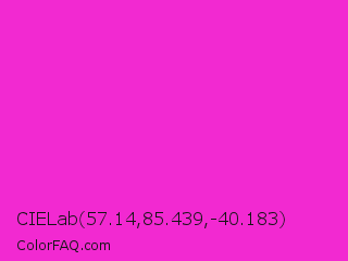 CIELab 57.14,85.439,-40.183 Color is a normal magenta color and the nearest color is Razzle Dazzle Rose #ff33cc. Hex code #f229d1 and RGB value is rgb(242,41,209). In RGB color space, this color is composed of 95% red, 16% green, 82% blue, In CMYK color space, this color is composed of 0% cyan, 83% magenta, 14% yellow , 5% black , In HSL color space, this color has a hue angle of 310° , 89% saturation and 55% lightness.