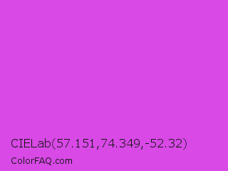 CIELab 57.151,74.349,-52.32 Color is a normal magenta color and the nearest color is Steel Pink #cc33cc. Hex code #d849e6 and RGB value is rgb(216,73,230). In RGB color space, this color is composed of 85% red, 29% green, 90% blue, In CMYK color space, this color is composed of 6% cyan, 68% magenta, 0% yellow , 10% black , In HSL color space, this color has a hue angle of 295° , 76% saturation and 59% lightness.