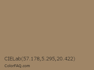 CIELab 57.178,5.295,20.422 Color is a normal orange color and the nearest color is Beaver #9f8170. Hex code #9f8566 and RGB value is rgb(159,133,102). In RGB color space, this color is composed of 62% red, 52% green, 40% blue, In CMYK color space, this color is composed of 0% cyan, 16% magenta, 36% yellow , 38% black , In HSL color space, this color has a hue angle of 33° , 23% saturation and 51% lightness.