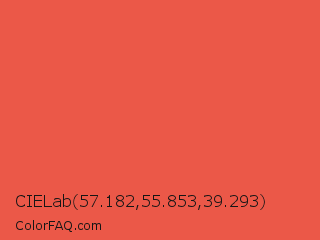 CIELab 57.182,55.853,39.293 Color is a normal red color and the nearest color is Carmine Pink #eb4c42. Hex code #eb5848 and RGB value is rgb(235,88,72). In RGB color space, this color is composed of 92% red, 35% green, 28% blue, In CMYK color space, this color is composed of 0% cyan, 63% magenta, 69% yellow , 8% black , In HSL color space, this color has a hue angle of 6° , 80% saturation and 60% lightness.