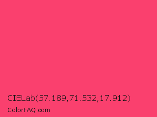 CIELab 57.189,71.532,17.912 Color is a light red color and the nearest color is Magic Potion #ff4466. Hex code #fa406e and RGB value is rgb(250,64,110). In RGB color space, this color is composed of 98% red, 25% green, 43% blue, In CMYK color space, this color is composed of 0% cyan, 74% magenta, 56% yellow , 2% black , In HSL color space, this color has a hue angle of 345° , 95% saturation and 62% lightness.